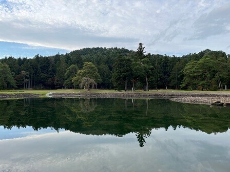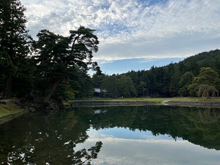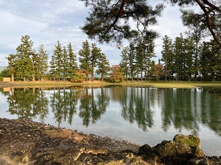 中尊寺もそうだったけれど、毛越寺でもまだ紅葉は進んでいない。でも一部ではオレンジ色に染まった木々もあり、水面に映ってなかなか美しい。