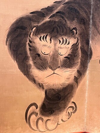 1室入口から左手すぐ、一周したつきあたりのところにあるのは、宗達の《龍虎図》と光琳の《虎図屏風》。両者の虎の虎らしくないネコ仕草。当然のごとく二人とも実物の虎など見たことはないだろうから、唐絵の虎を模倣したんだろうと思う。龍も含めて、当時的には虎も想像上の産物だったのだろうが、なぜにこうユーモラスになってしまうのだろうか。