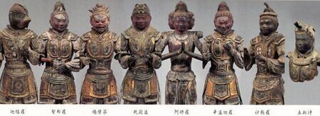 十大弟子立像・八部衆立像、いずれも734年に完成した西金堂に安置されたので、ほぼその頃の作例とされている。作者は仏師将軍万福と画師秦牛養(はたのうしかい)とされている。いずれも脱活乾漆造による。